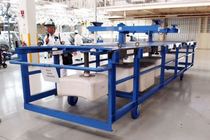 物流領域においても、搬送コンベアの形状をループ状にすることで、組み付け開始時の部品ラック投入と、組み付け完了時の空箱回収の拠点をひとつに集約。部品の搬入拠点数を最少化することで、工場内の部品運搬作業量を既存ラインから約10%削減したという。
