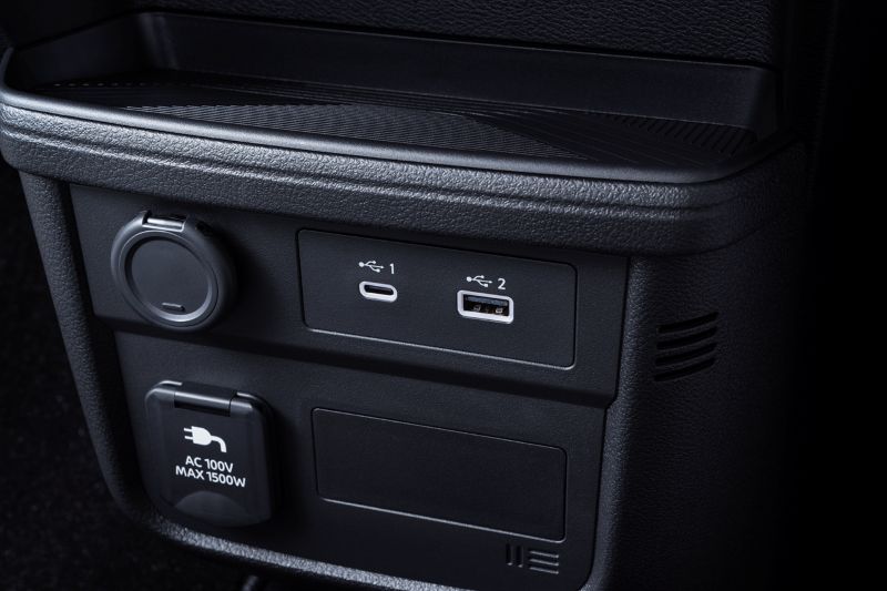 装備面では、充電ポートリッドや充電コネクタにいたずらを防止するためのロック機構を追加。新たに100V AC電源(1500W)をラゲッジルームとインストルメントパネルの2ヶ所へ設定。この電源により、家電製品が車内で使えるようになる。キャップなどで便利な他、災害などによる停電時に、サクラを電源車として使用できる。