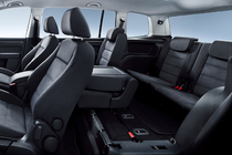 インテリアもエクステリアと同様に、フォルクスワーゲンの新しいデザイントレンドをフォロー。ホワイトイルミネーションのメーターパネル採用、3 本スポークのレザーステアリングホイールとレザーシフトノブはともに新しい形状に変更され、高い質感と機能性を実現している。効果的に配置されたクロームのアクセントもデザイン性を高めるのにひと役買っている。そのほか室内の主要なユーティリティについては、基本的に変更はない。機能的なシートアレンジで1人乗車から7人乗車まで、乗車人数と荷物の量に合わせてフレキシブルに使うことができる。