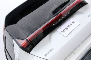新型サクラのエクステリアは、デイズから力強いキャラクターラインとキックアップしたウインドーグラフィックを受け継いでいるが、フロントマスクなどにアリアの先進的なテイストを注ぎ込んでいる。