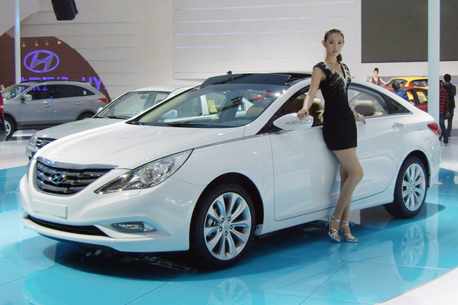 ちなみに〆は口直しに「現在最も頑張っているデザイン」と言われている現代自動車の『ソナタ』。2010年にデビューするや、カムリやアコードを猛追する売れ行きを見せている。皆さん「カッコ良い」。キレイなお姉さんは中国の人であります。日本車も頑張って欲しい。