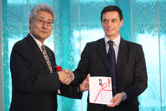東京都小笠原村 森下 一男 村長と握手を交わし目録を贈呈したマセラティ ジャパン株式会社 ファブリッツィオ・カッツォーリ 代表取締役社長