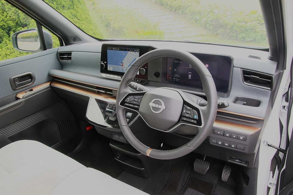 サクラのインテリアは、なかなかキレイにまとめられている。水平基調のダッシュボードはスッキリ感とワイド感を併せ持つ。9インチの大型ディスプレイをセンター上部に設置した。